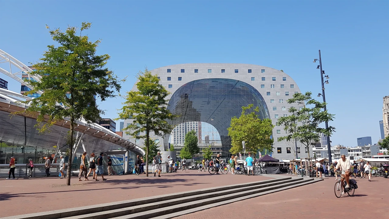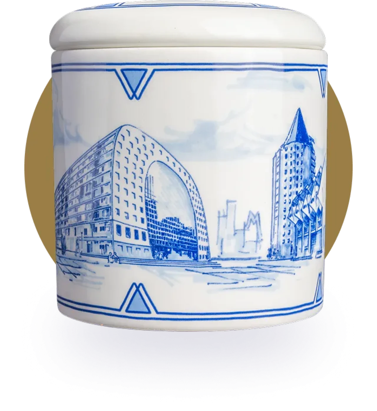 In collaboration with Royal Delft we created a unique stroopwafel jar featuring the Rotterdam skyline with the Markthal at its centre. This special jar is available exclusively from us at Goudstroop Rotterdam.